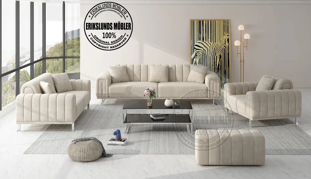 Dream soffgrupp 3+2+1 i beige sammet med silver ben