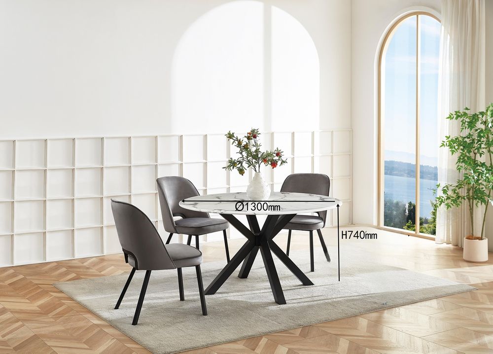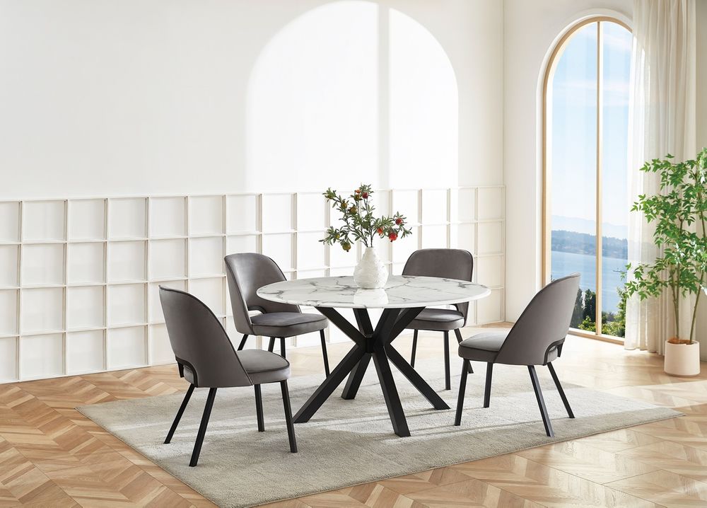 Modernt matbord Marbella runt i vit-grå konst-marmor (komposit) och pulverlackerade ram i svart stål.