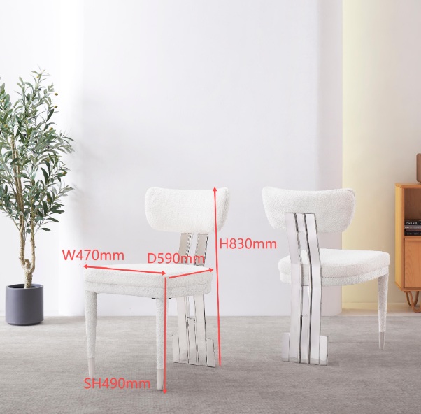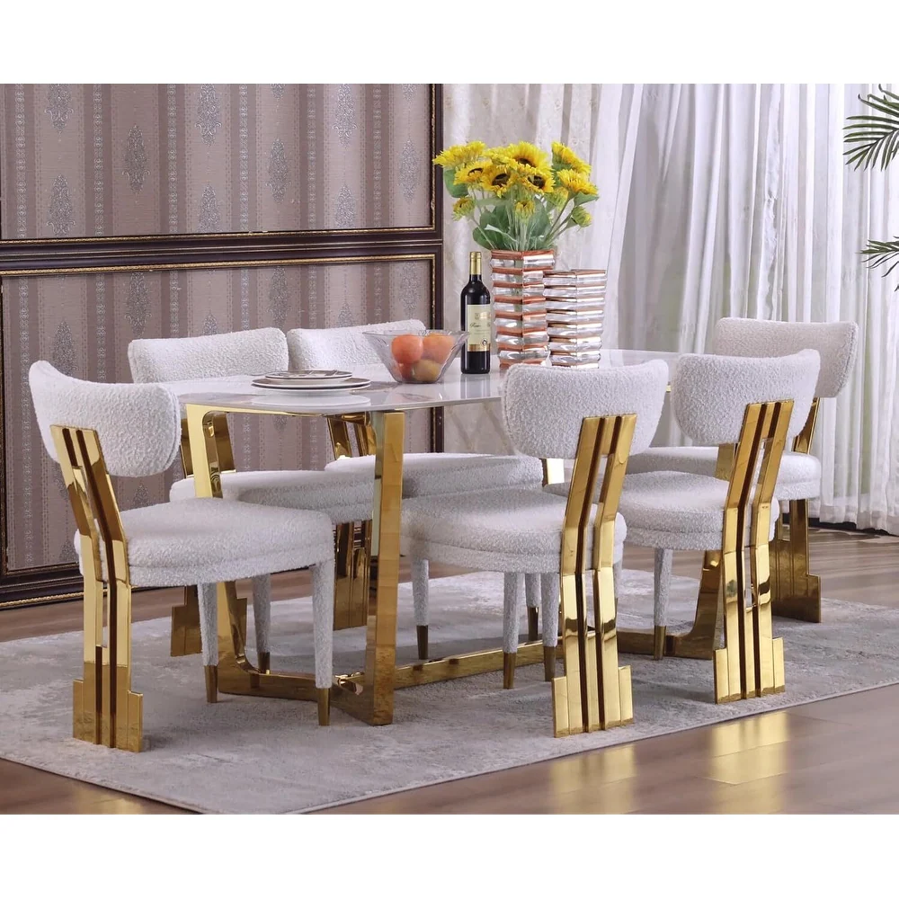 Jolina är en modern köksstol i vit bouclè med guld färgade ben av metall. Snygg välvd rygg och stoppad sits för god komfort.