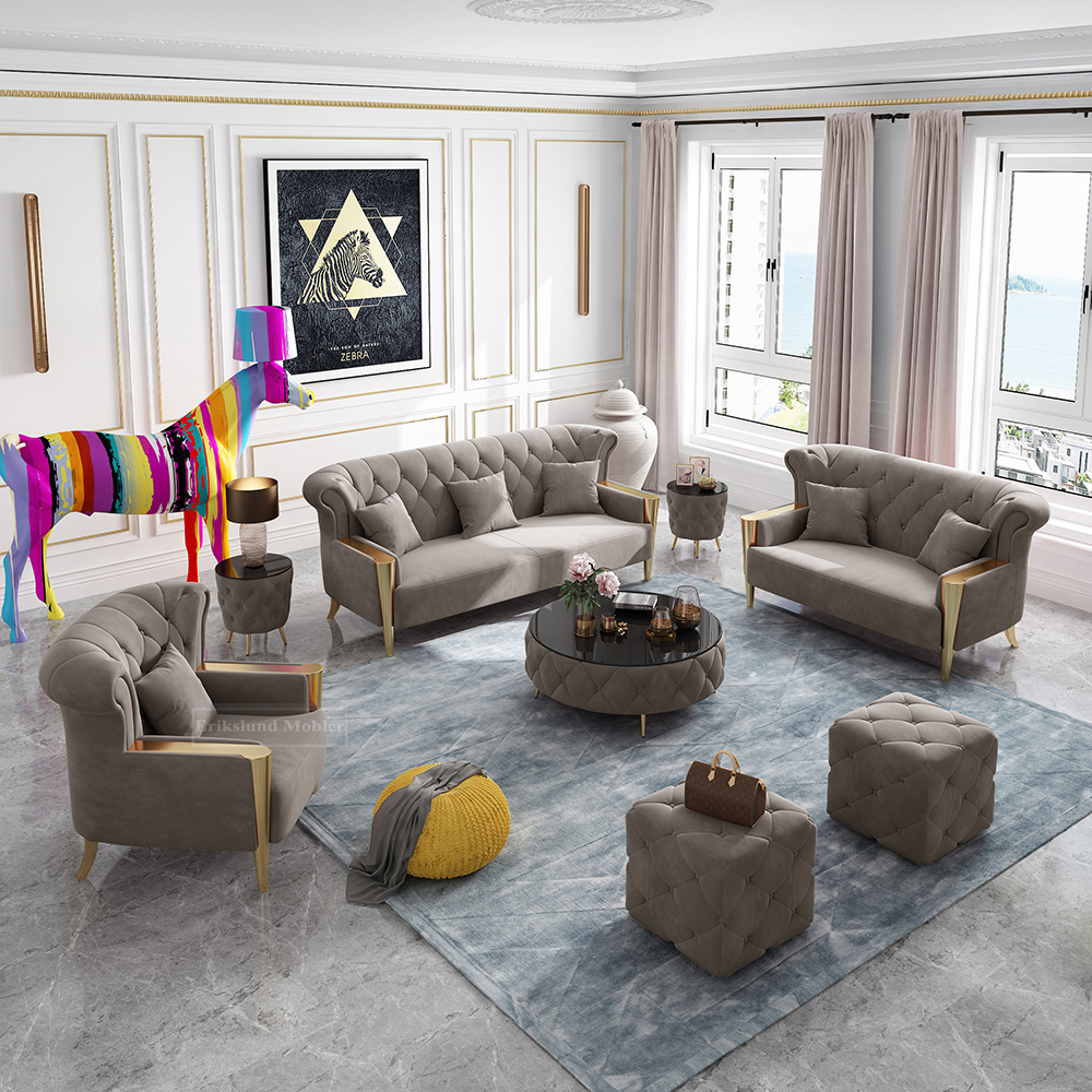 Palm soffgrupp i gråbeige sammet med guld ben