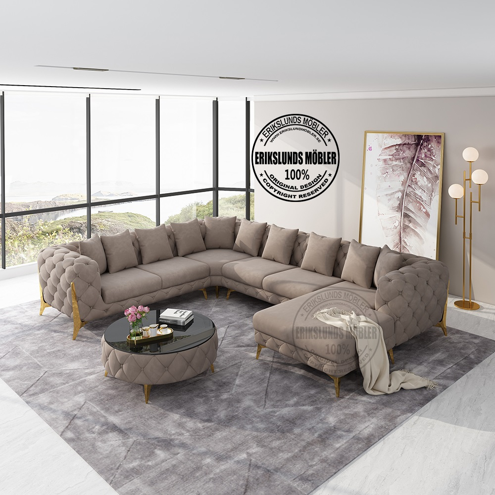 Lyxig och rejäl divansoffa höger divan i gråbeige sammet med guld ben