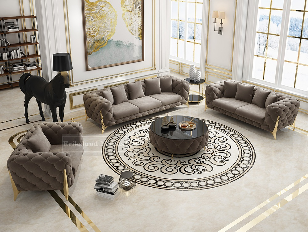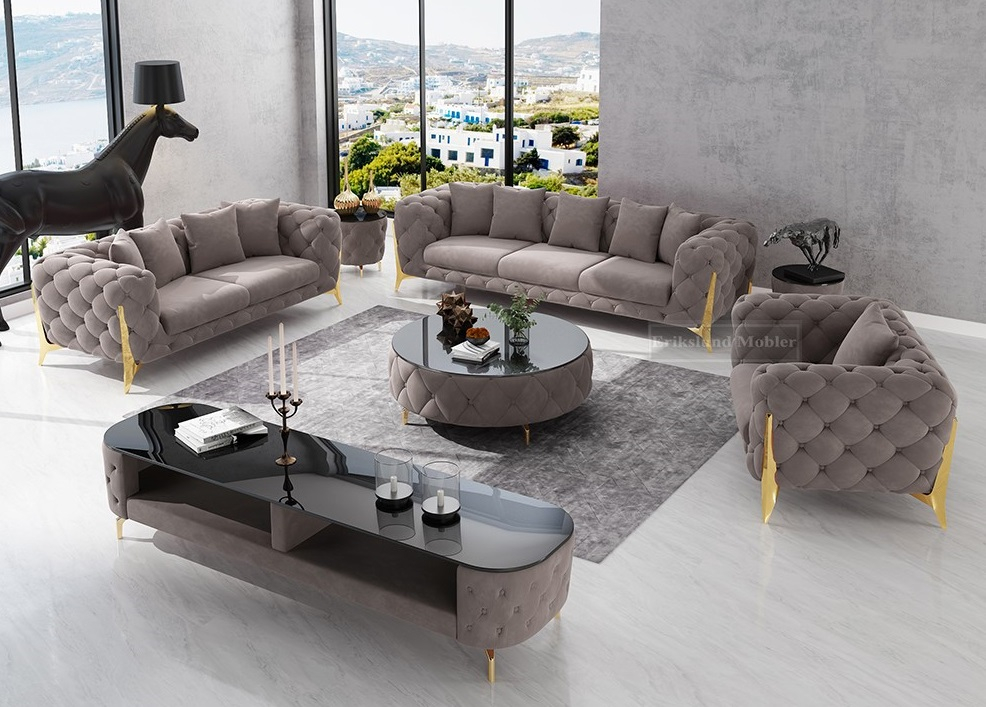 Lyxig och rejäl soffgrupp i gråbeige sammet med mjuka, runda former och eleganta detaljer. Benen är gjorda utav rostfri metall.Soffgruppen är stor och rymlig och ger ett elegant och lyxigt intryck med sitt detaljerade utseende.I priset ingår även 10 st dekorations-kuddar