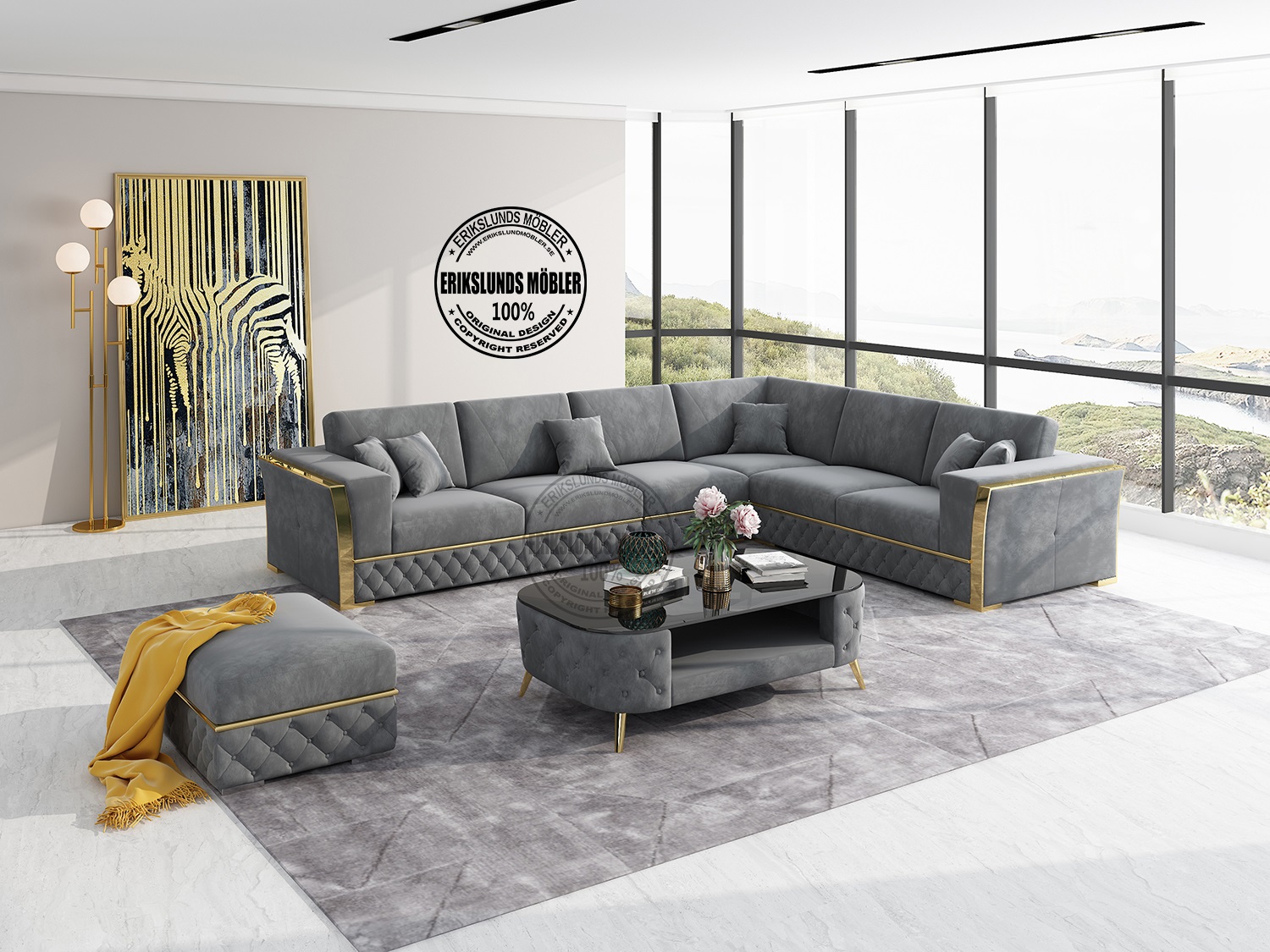 Lyxig hörn-soffa i mörkgrå sammet tyg och eleganta detaljer.