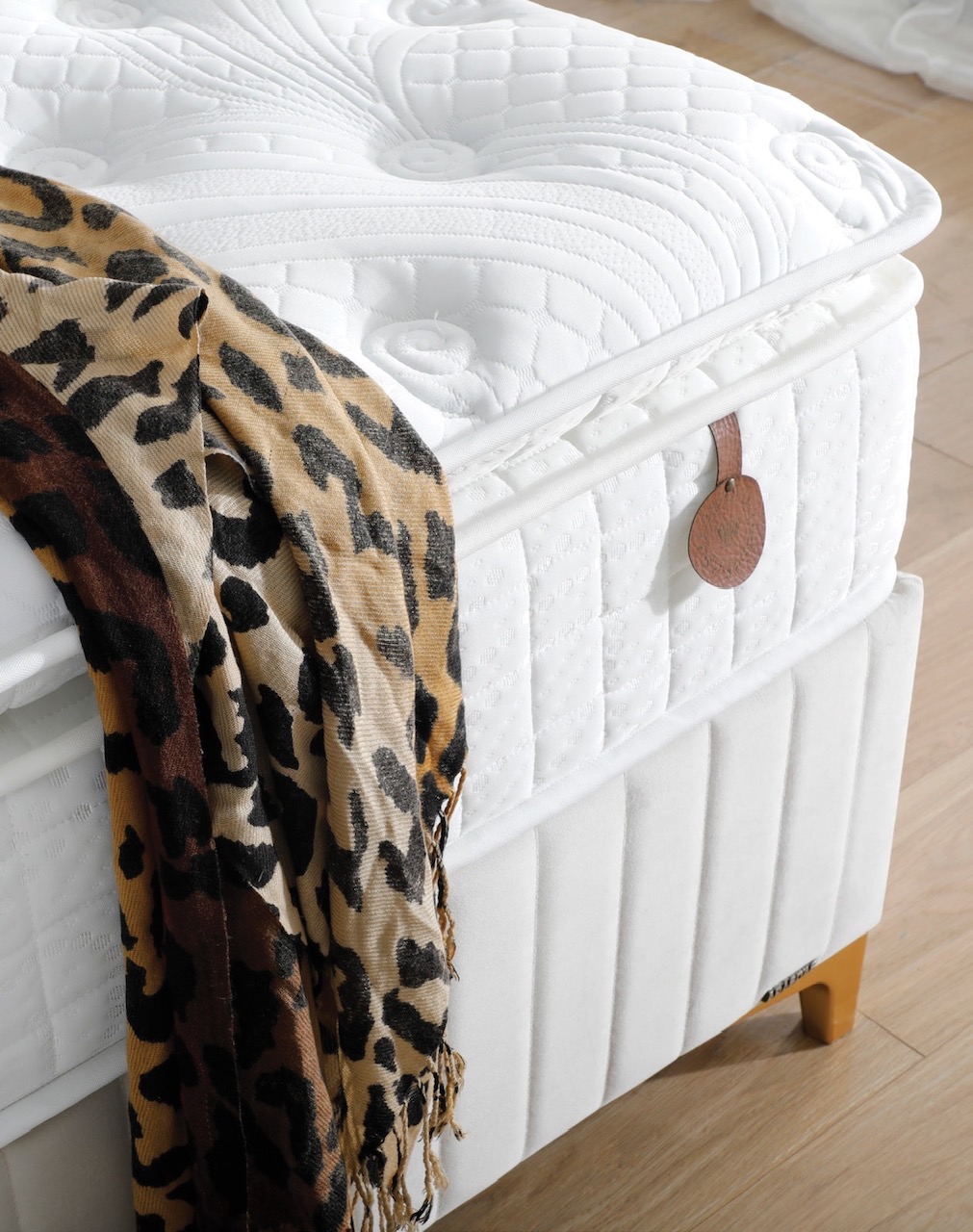 Det höga, djupt knappklädda huvudgaveln med dekorativa sömmar och stilrena nitar längs sidorna skapar en hotellkänsla och ger utmärkt stöd när du sitter upp i sängen. Den medföljande madrassen är generöst vadderad för optimal sovkomfort och god tryckavlastning.
