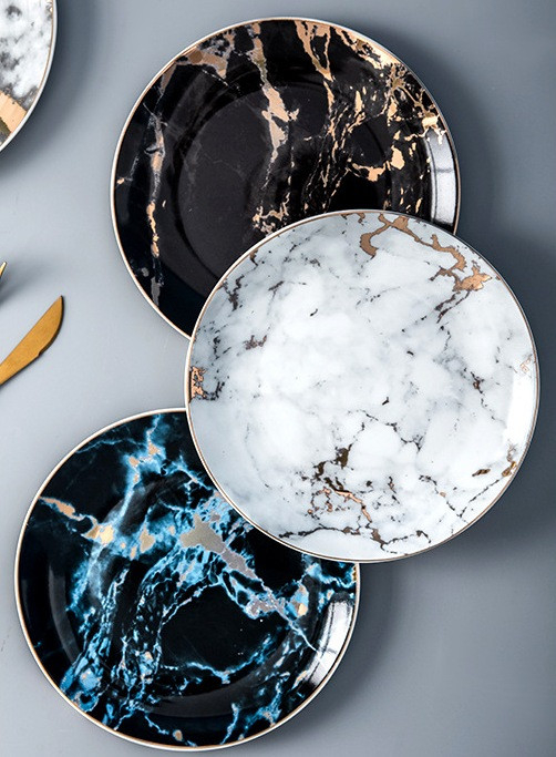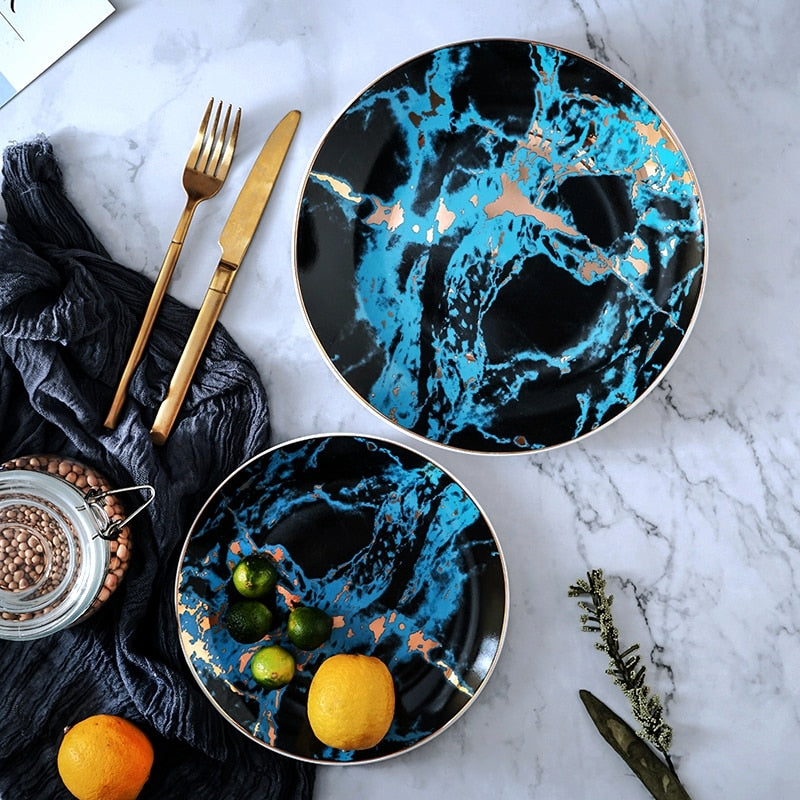 Tallrik/ Assiett med blå/ roseguld marmormönster.