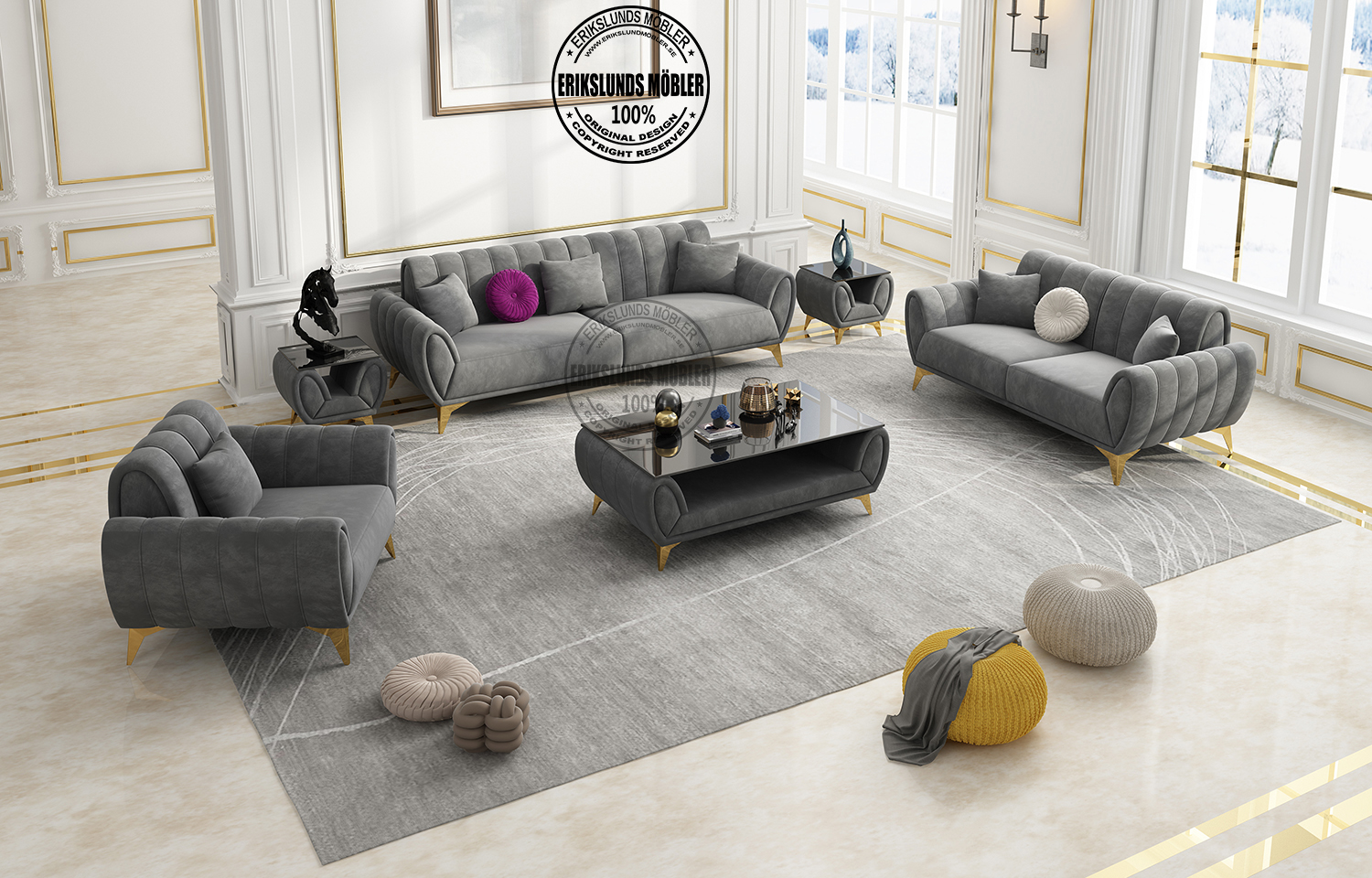 Karin soffgrupp 3+2+1 mörkgrå sammet guld ben