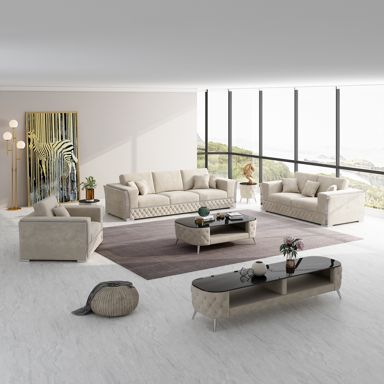 Rose soffgrupp 3+2+1 beige sammet silver ben